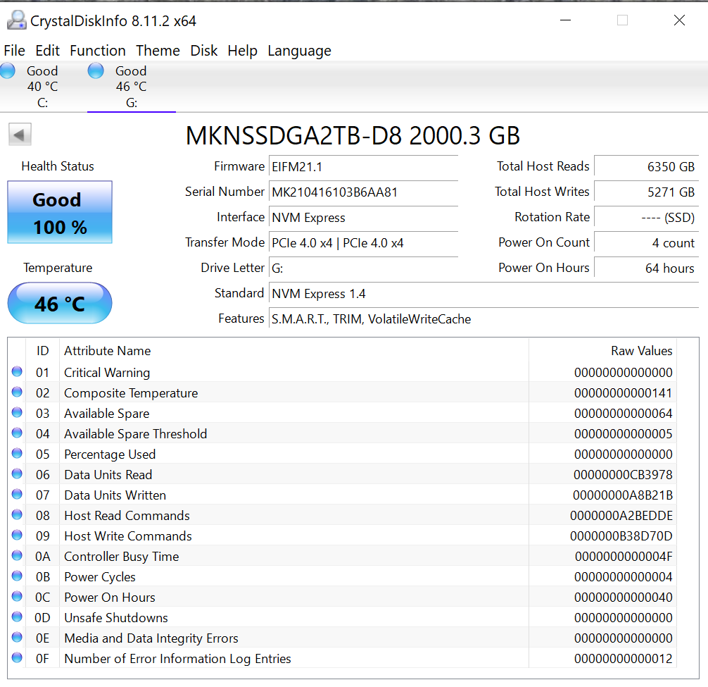 Crystal DiskInfo validates that we are running in Gen 4×4 mode and, as well, that we are running in the NVMe 1.4 protocol