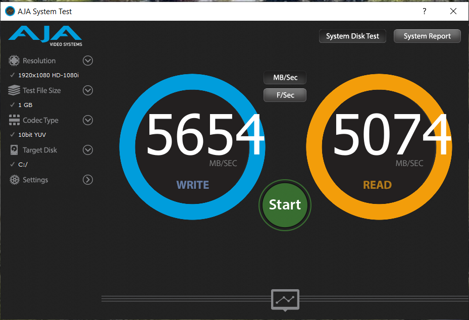 The AJA Video Systems Disk Test is relatively new to our testing and tests the transfer speed of video files with different resolutions and Codec.