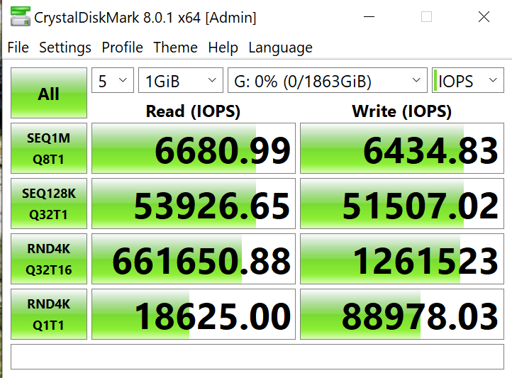 Two things we have noticed with the new Intel Gen 4 system is that benchmark performance increases significantly with certain variables. For instance, we can see in the first result above that low 4K write performance peaks at 364MB/s while the second chart shows write IOPS at over one million.