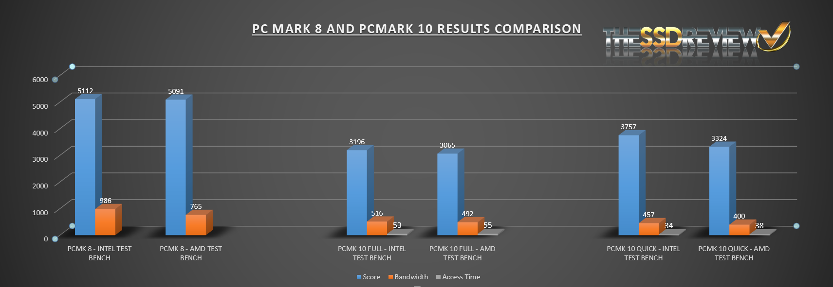 If you have been following along and doing a comparison throughout this report, you might be of the opinion that AMD has the edge, especially when you see a difference of a few hundred megabytes in sequential testing. Looking at all three PCMark 8 and PCMark 10 results however, the Intel Test Bench has consistently provided better results, albeit it by a narrow margin for each test.