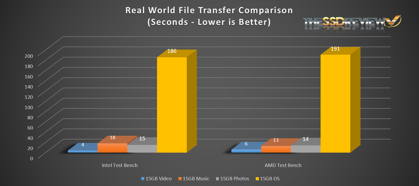 For our True Data Testing, we simply loaded 15GB video, music, photo and OS files onto the E18 B47R sample SSD and copied the data to a new folder on that same disk. This was done on both the Intel and AMD Test Benches and the results as shown in this chart.