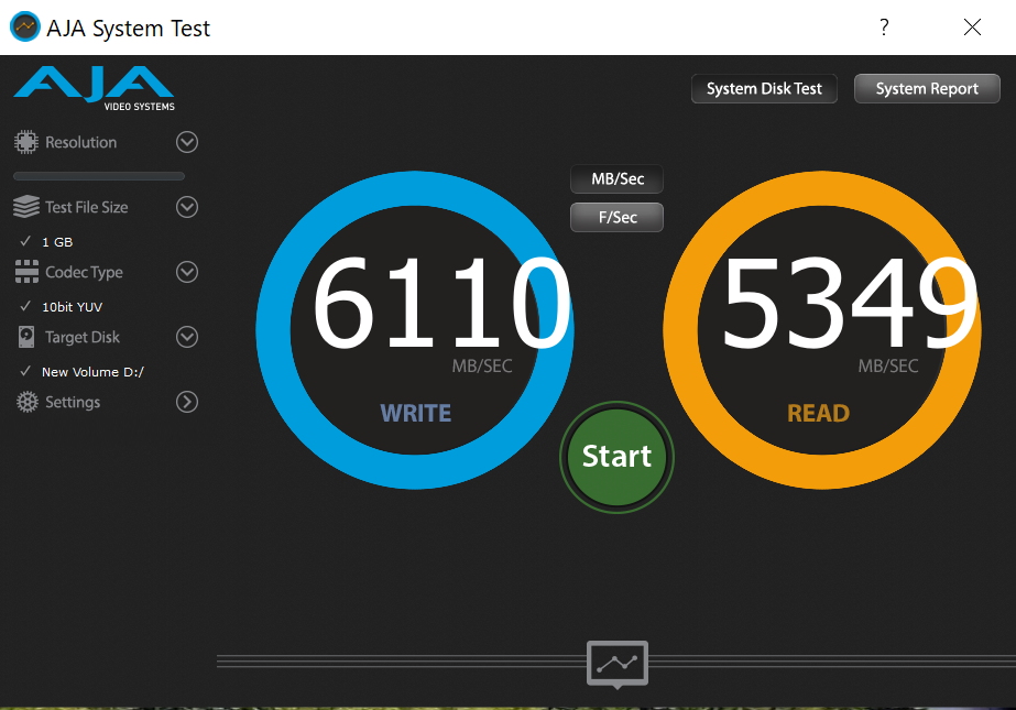 The AJA Video Systems Disk Test is relatively new to our testing and tests the transfer speed of video files with different resolutions and Codec.
