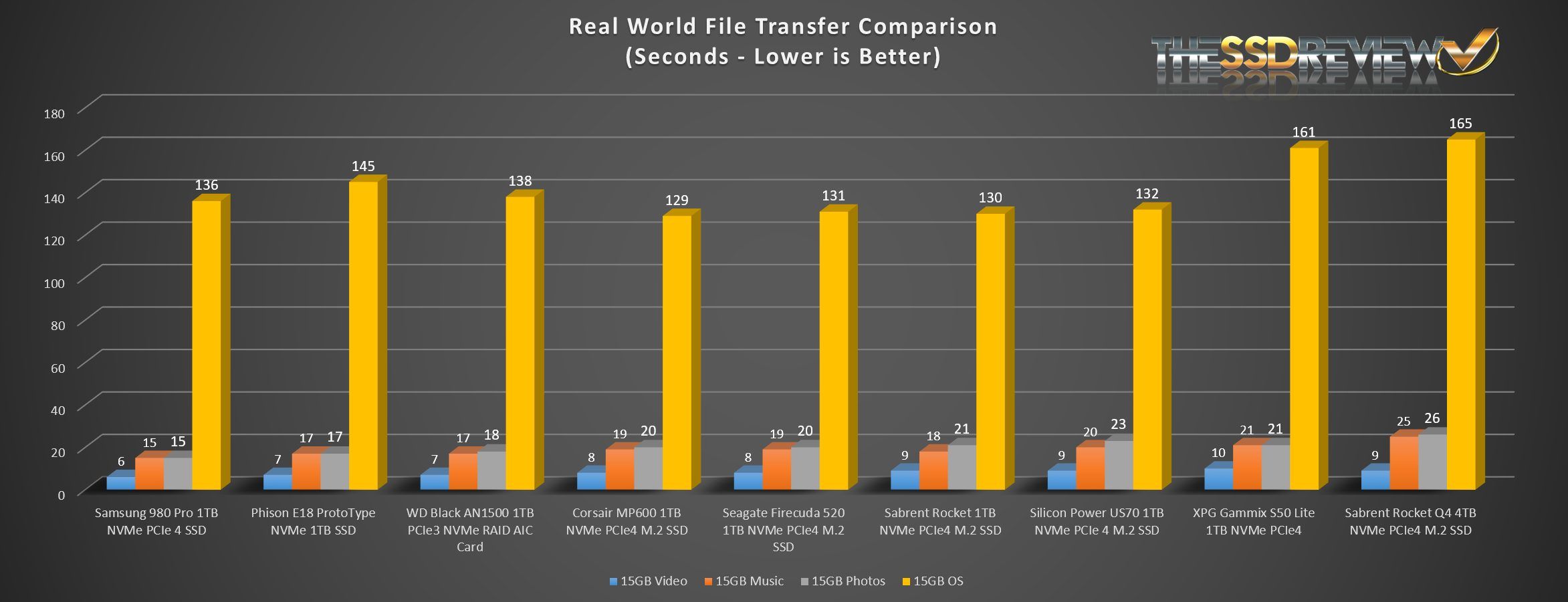 We have put the Phison PS5018-E18 Prototype Gen 4 NVMe SSD beside a few of the best PCIe 4.0 SSDs in the business for our true to life data testing. In this test, we simply place 15GB files representing music, video, pictures and operating systems onto the target drive. We then copy each file from one place on the target disk to another, recording the time taken for the transfer.