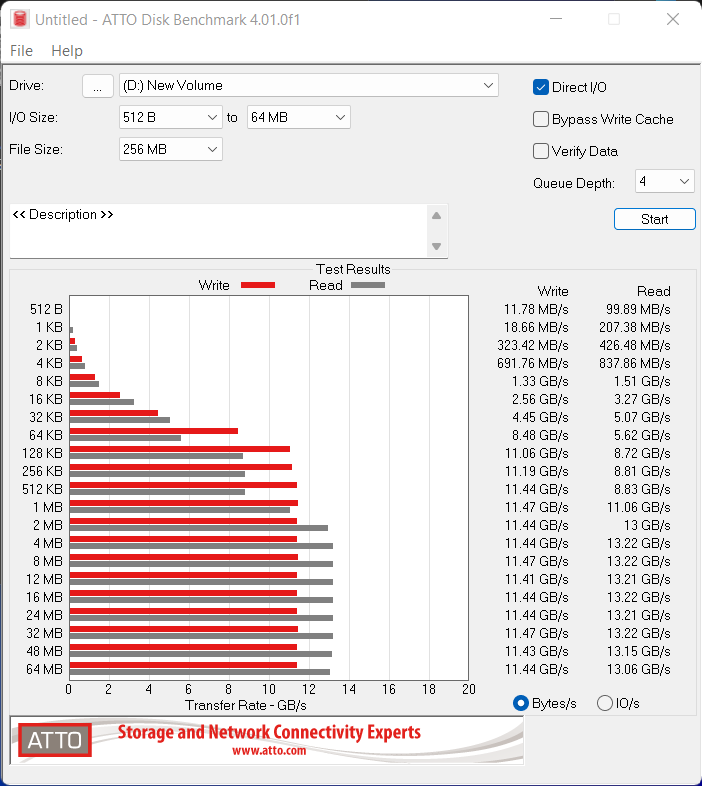 ATTO performance hits highs of 13.06GB/s read and 11.44GB/s write are the best we have seen to date for this software when testing a M.2 SSD. Very encouraging as well is the fact that performance consistently rises as data sizes increase. We have always found this to be the trademark of a solid SSD.