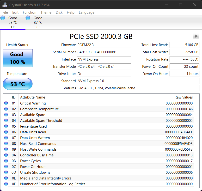 Crystal DiskInfo validates that our SSD is running in PCIe 5.0 x4, using the NVMe 2.0 protocol and confirms that it is TRIM capable.