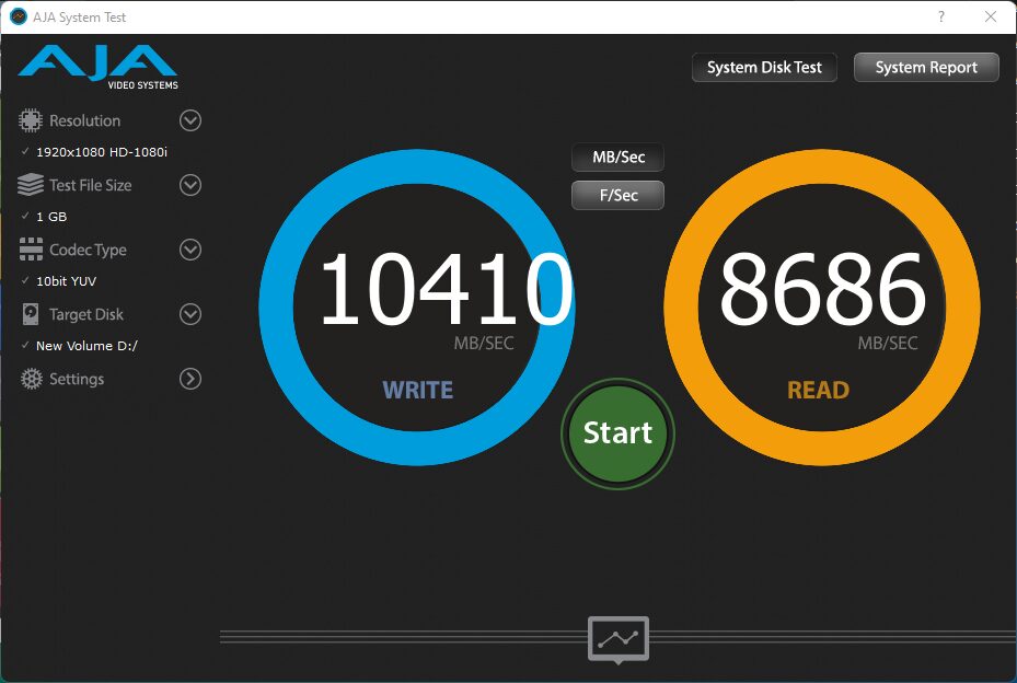 The AJA Video Systems Disk Test is relatively new to our testing and tests the transfer speed of video files with different resolutions and Codec.