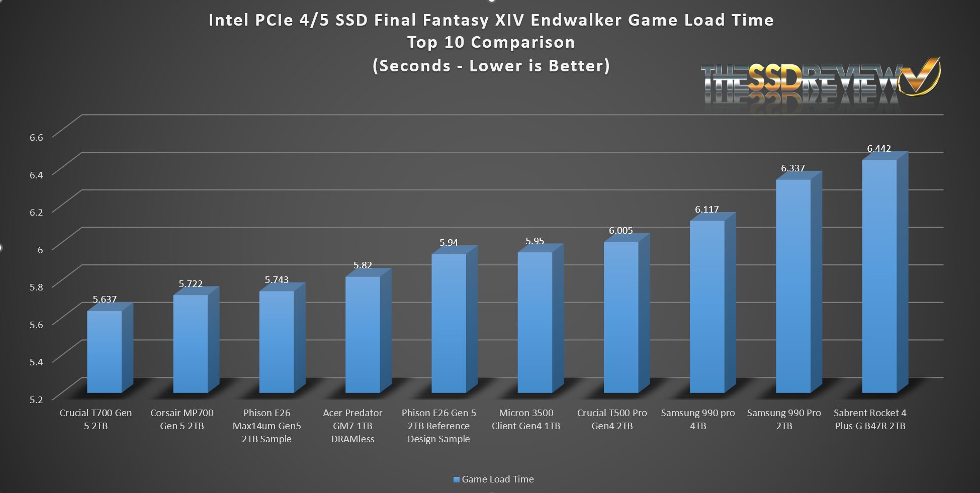 Game load time testing demonstrates the Phison E26 Max14um with an excellent load time of only 5.7 seconds.