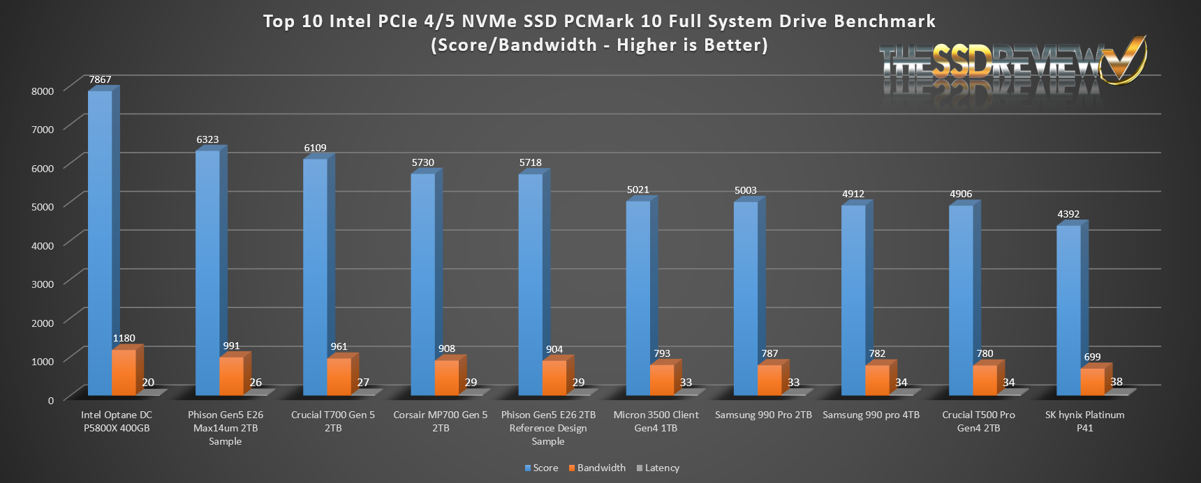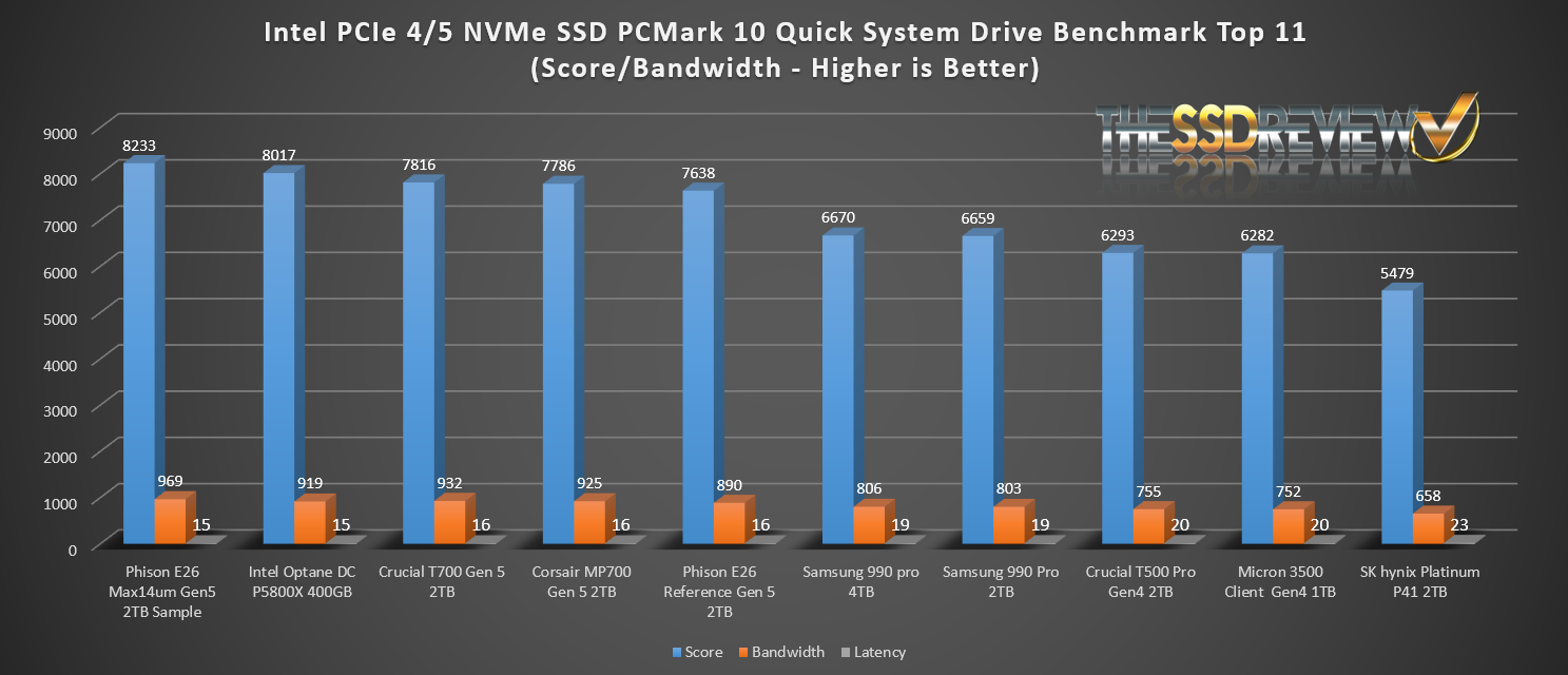 The Phison E26 Max14um placed right where we figured it would which was just behind the Intel Optane but ahead of all other SSDs tested.