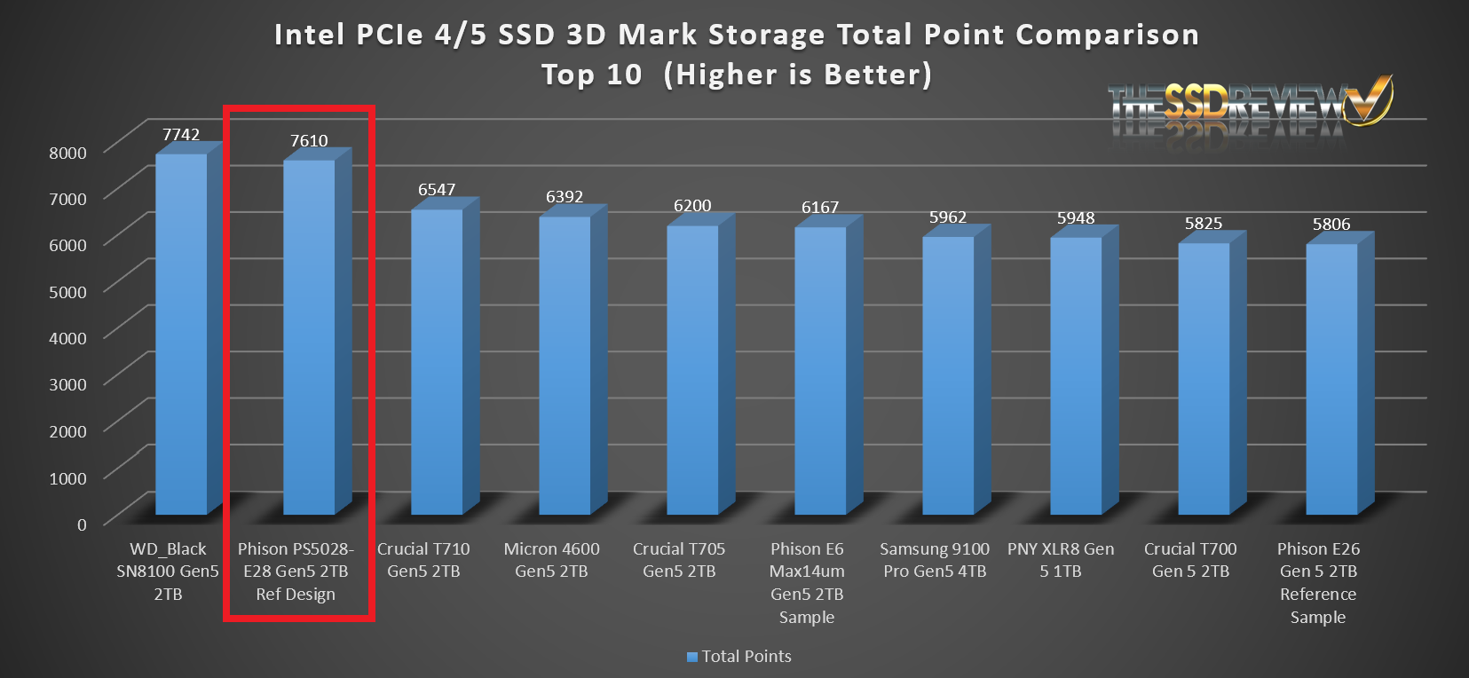 Although we never intended to have a head to head challenge between the current WD_Black SN8100 and the soon to be available Phison PS5028-E28 Gen5 SSD controller, it soon became apparent that the two were exchanging blows from benchmark to benchmark. Both SSDs jumped up as top SSD tested in a number of categories and both sat side by side in all but one test, this being our Final Fantasy XIV Game Load Time Benchmark. In this test, the SN8100 displayed a 5.2s game load time average with the Phison E28 coming with a 6.3s result. This is the test where tenths of a second mean the world in final placement.