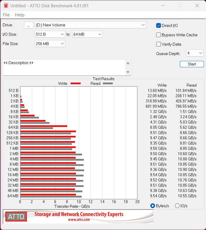 ATTO performance hits highs of 10.9GB/s read and 9.5GB/s write are in line and actually a bit better than listed specs for write performance.