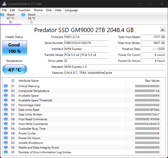 Crystal DiskInfo validates that our SSD is running in PCIe 5.0 x4, using the NVMe 2.0 protocol and confirms that it is TRIM capable.