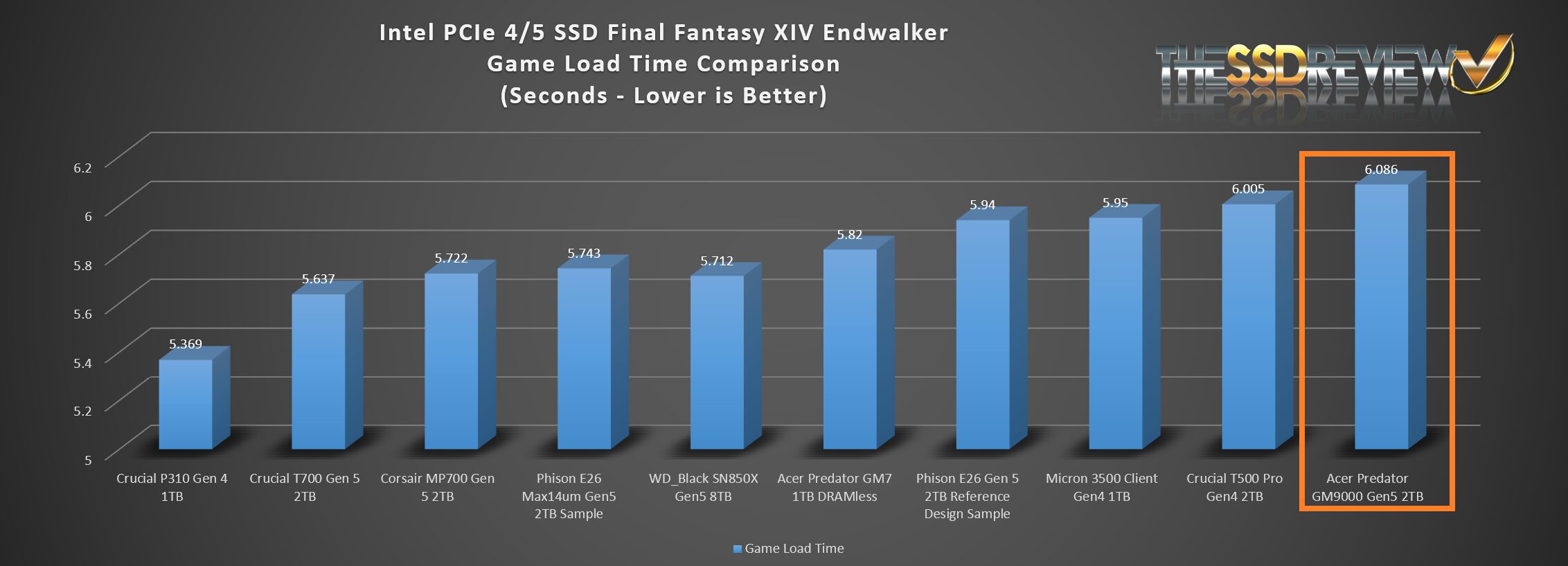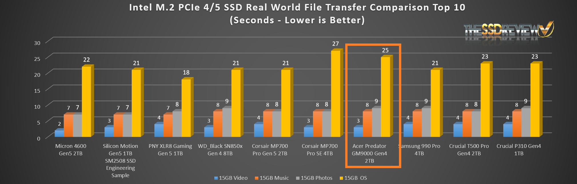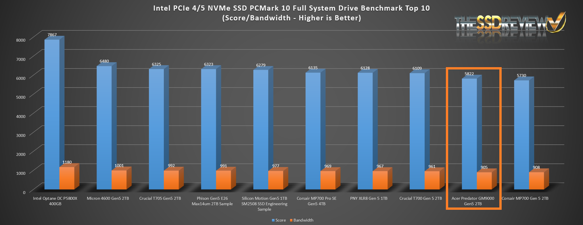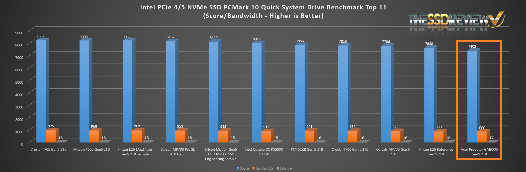The Predator GM9000 placed seventh in our Top 10 of all SSDs tested to date.