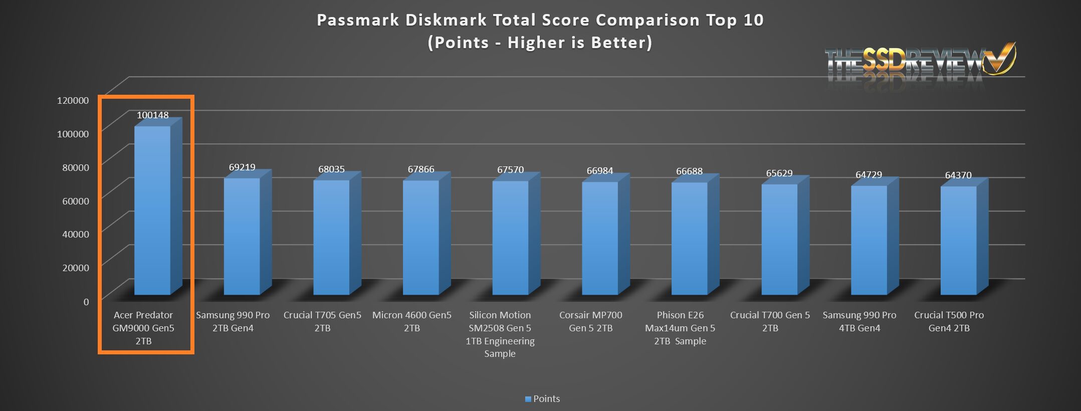 The Predator GM9000 Gen 5 NVMe SSD placed in the Top 10 of all SSDs tested to date with this software.