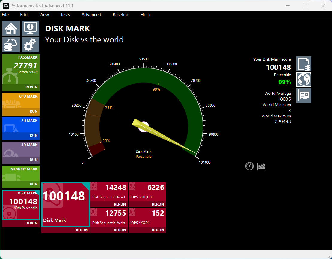 The Acer Predator GM9000 Gen5 2TB SSD achieved the top mark ever attained in Passmark Diskmark…but there is a reason. This software was recently upgraded to Ver 11 that accommodated such.
