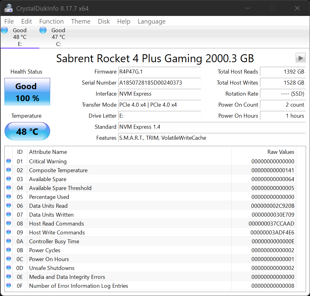 Crystal DiskInfo validates that our SSD is running in PCIe 4.0 x4, using the NVMe 1.4 protocol and confirms that it is TRIM capable.