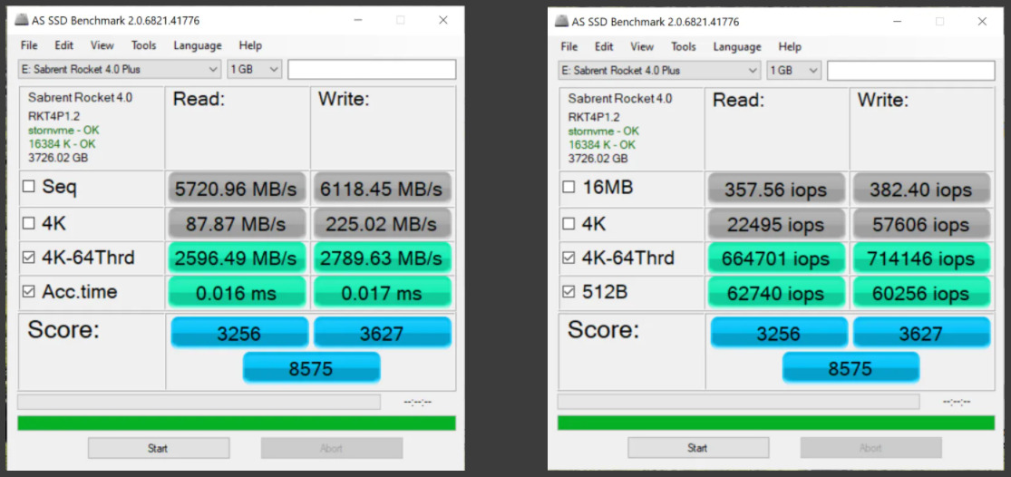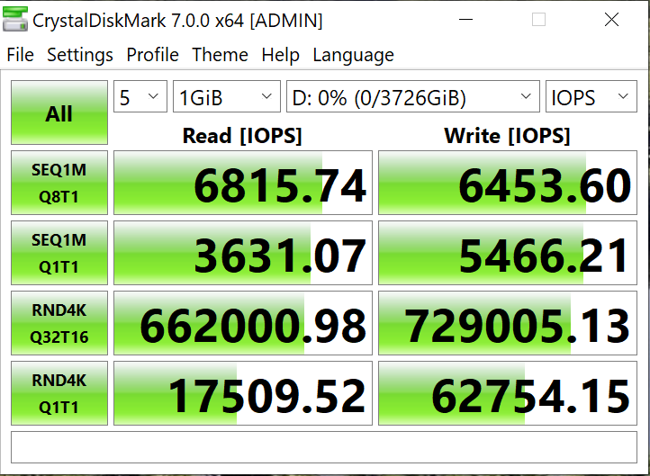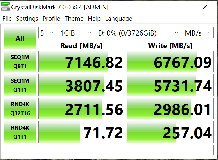 Crystal DiskMark results once again validate that listed specs of 7.1GB/s read and 6.6GB/s write are right on the money.