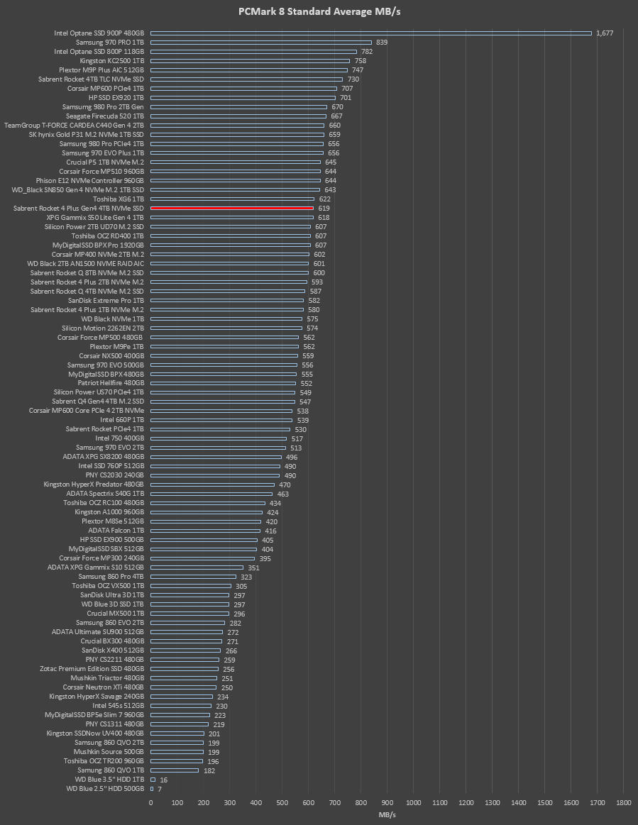 PCMark 8 results for the Sabrent Rocket 4 Plus are pretty good and much better than we had seen in the one and two terabyte versions.