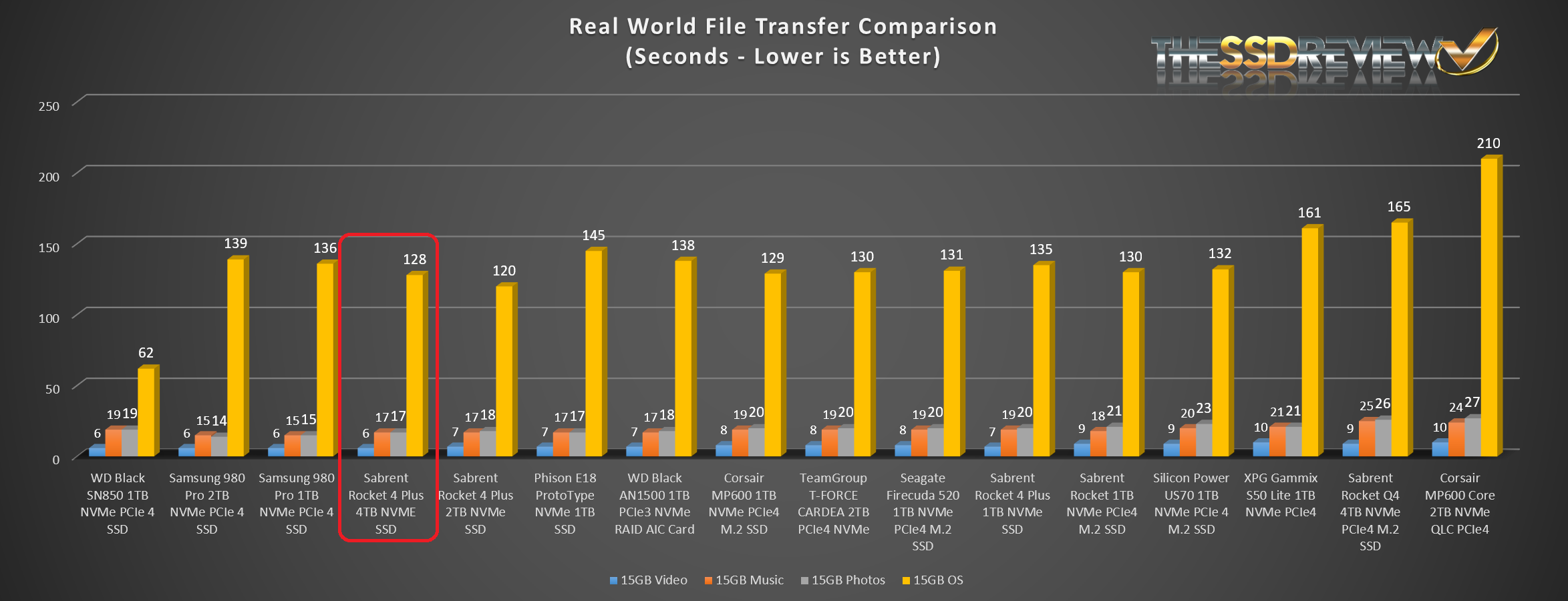 For our Real World File Transfer Comparison of the world’s top M.2 NVMe SSDs, we have included several of the top Gen 4 SSDs tested to date, to include the Sabrent Rocket 4 Plus, WD Black SN850, Samsung 980 Pro, Corsair MP600, Seagate FireCuda 520, Sabrent Rocket, XPG Gammix, the Silicon Power US70 and the Sabrent Rocket Q series. This test is conducted through the transfer of data from one spot on the test drive to another to give us the truest of transfer speed results for that device.