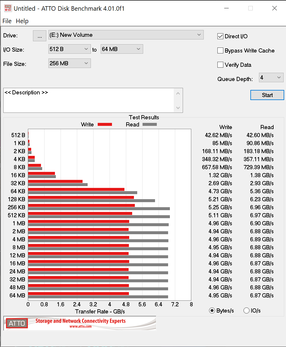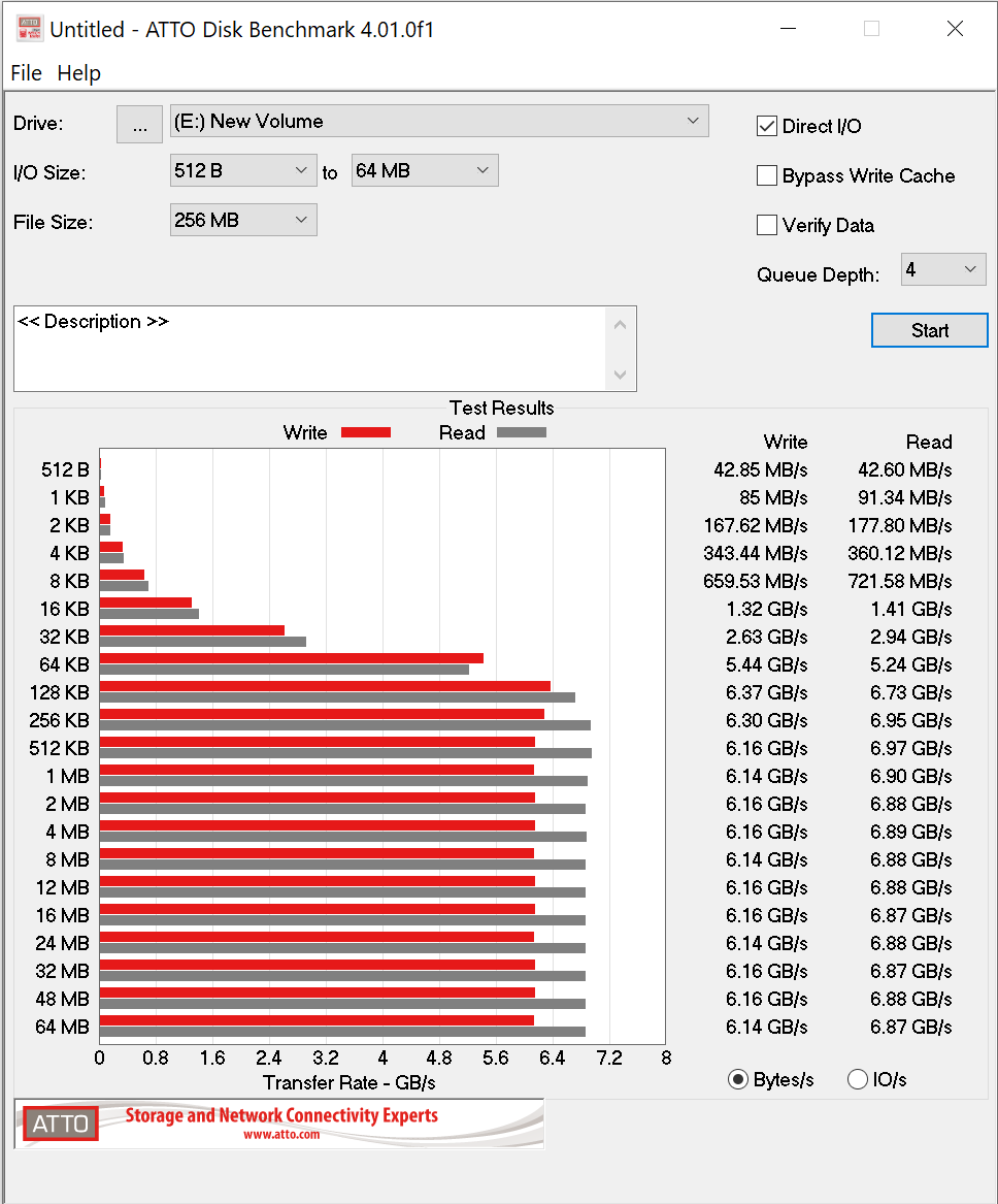 ATTO Disk Benchmark is perhaps one of the oldest benchmarks going and is definitely the main staple for manufacturer performance specifications. ATTO uses RAW or compressible data and, for our benchmarks, we use a set length of 256mb and test both the read and write performance of various transfer sizes ranging from 512b to 65mb. Manufacturers prefer this method of testing as it deals with raw (compressible) data rather than random (includes incompressible data) which, although more realistic, results in lower performance results.