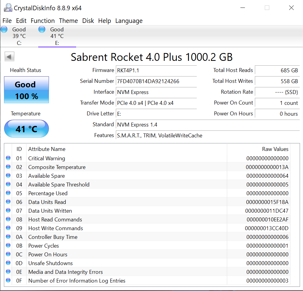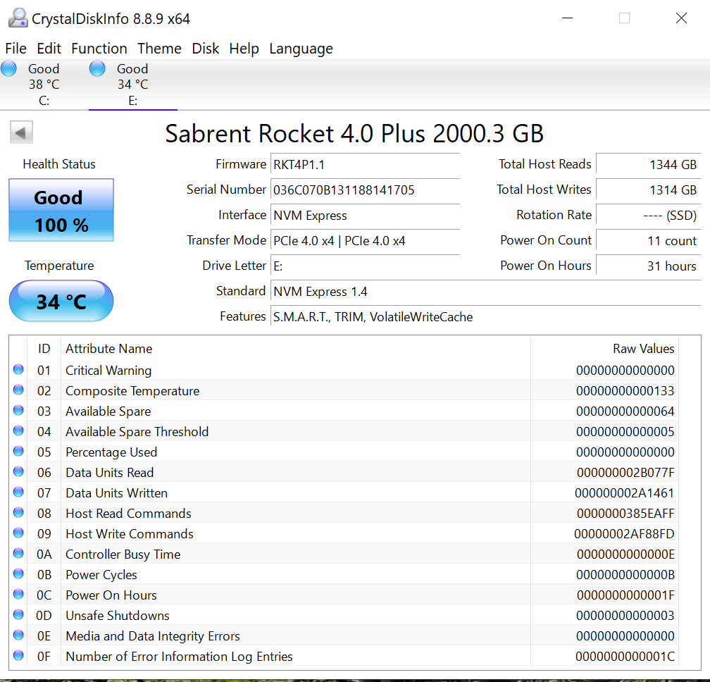 Crystal Disk Info validates that our SSDs are running in PCIe 4.0 x4 (four lane), and also that NVMe 1.4 protocol is in use with features to include SMART, TRIM and VWC.