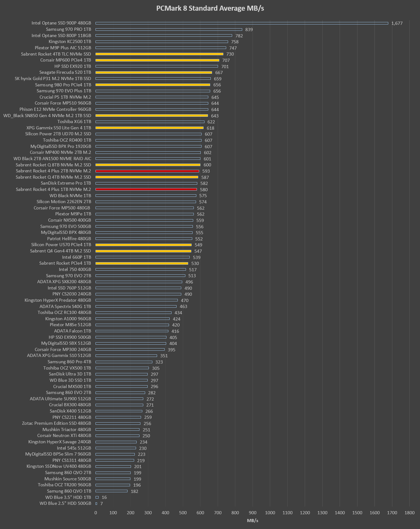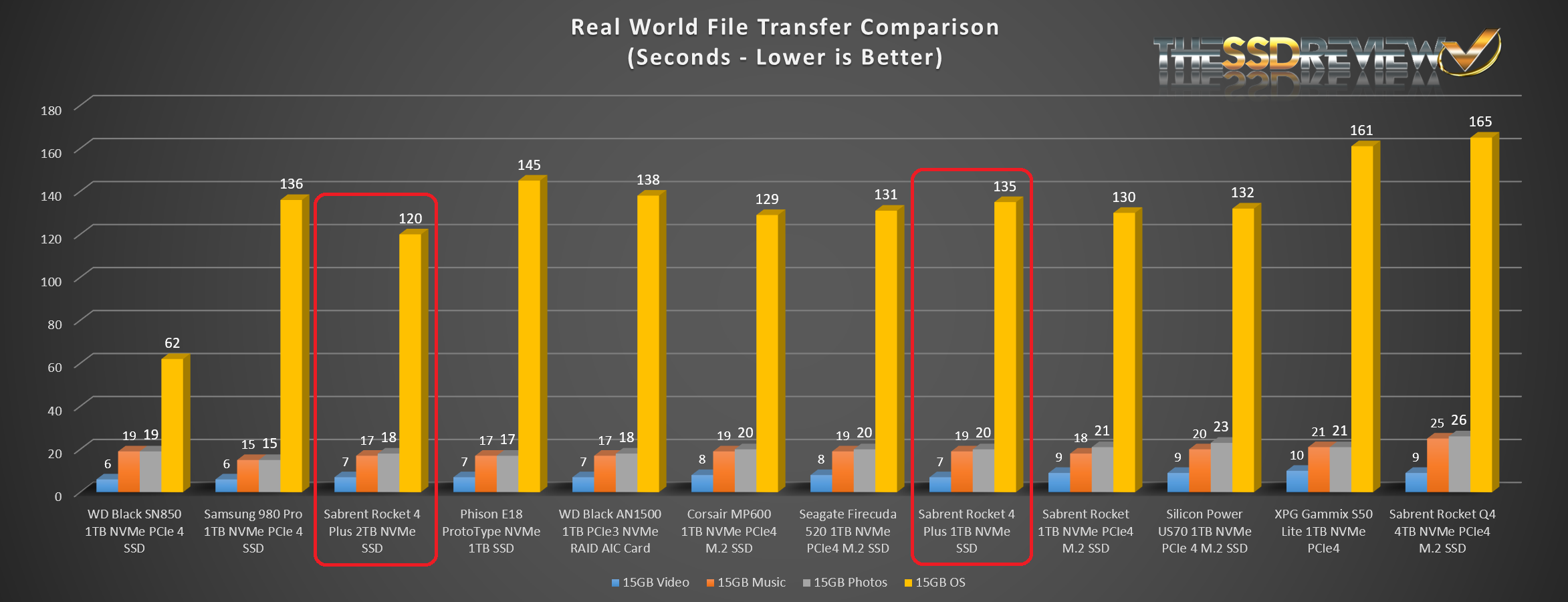 Although this chart is a fairly simple test of moving different types of data from one part of the SSD to another, it traditionally has been very accurate in depicting the best of the best, as well as any that lag just a bit too far behind. The WD Black, Samsung 980 Pro and Sabrent Rocket 4 Plus are the top three on the block right now, which actually differs from traditional result where Samsung seemed to always prevail.