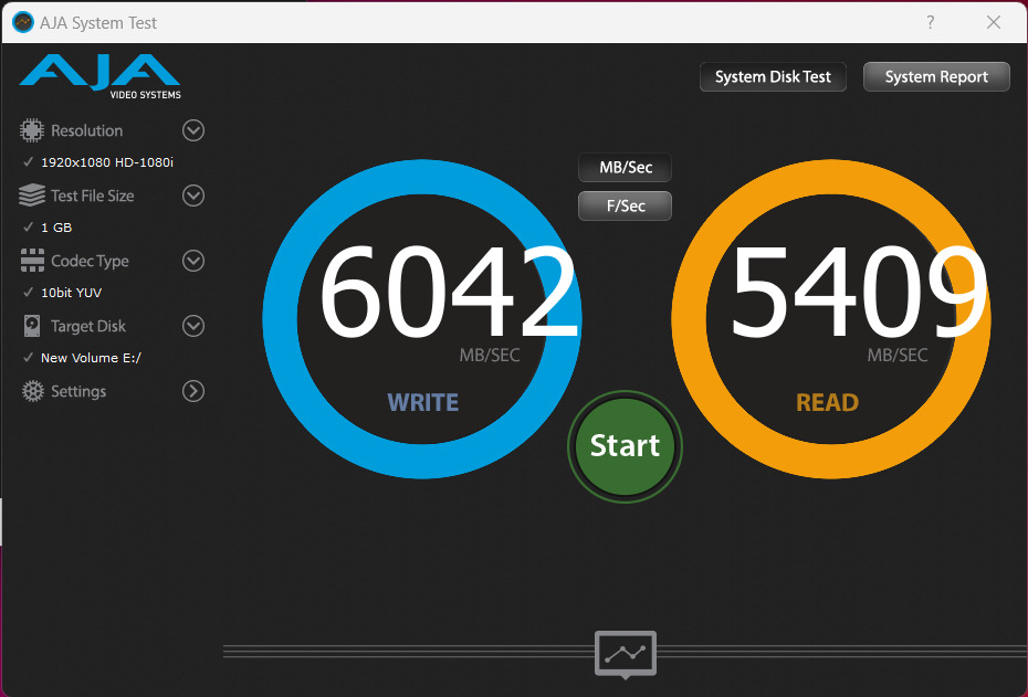 The AJA Video Systems Disk Test is relatively new to our testing and tests the transfer speed of video files with different resolutions and Codec.