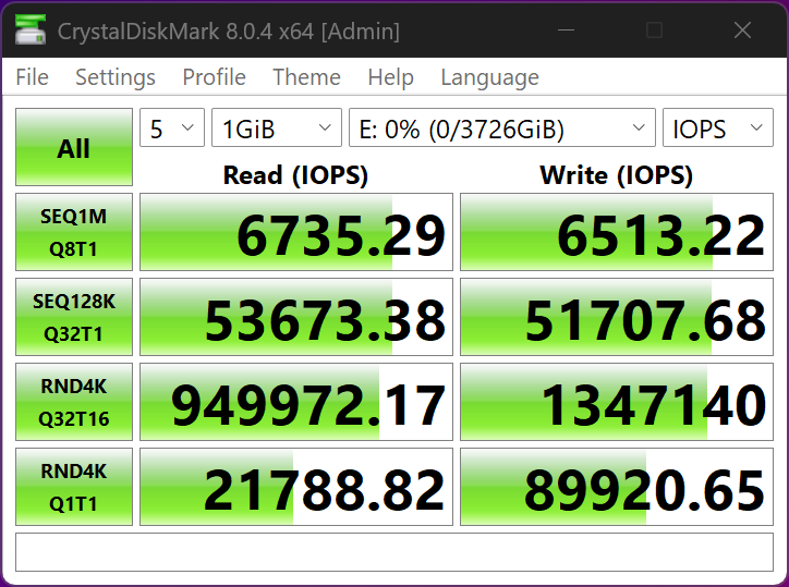 Crystal DiskMark results are just about the best we have seen with low 4K read random throughput just short of 90MB/s and IOPS just short of that million mark.