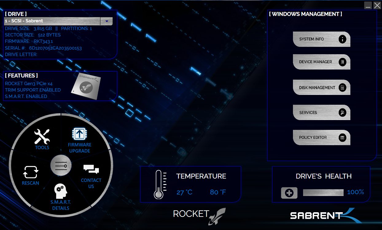 The information sticker is on the back and removal of the branding on either side would, of course, void your warranty. Sabrent also includes free software such as Acronis True Image HD and their own SSD maintenance and monitoring utility called the Sabrent Rocket Control Panel.