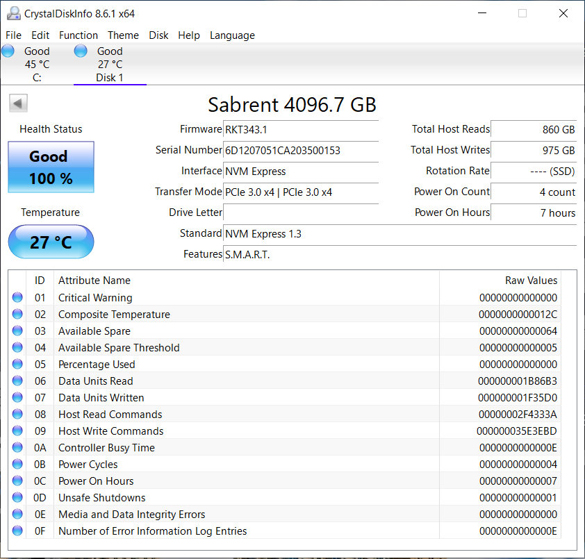 Crystal Disk Info validates that our SSD is running in PCIe 3.0 x4 (four lane), and also that NVMe 1.3 protocol is in use.