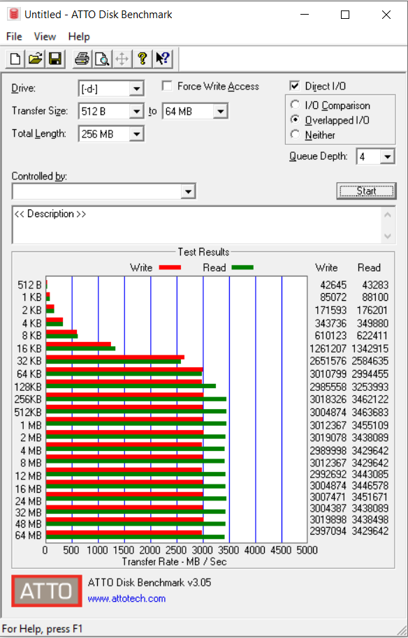 Listed specifications for the Sabrent Rocket NVMe 4TB SSD are 3450MB/s read and 3000MB/s write. These results are pretty much bang on, but just as importantly, there is a very steady speed progression with data size increase.
