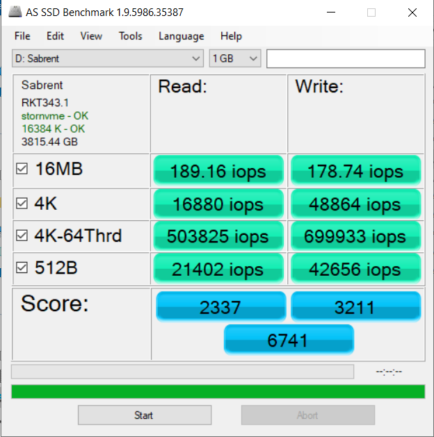 Crystal DiskMark results are fairly consistent with ATTO, at least with respect to the high sequential read and writes. Check out those IOPS!