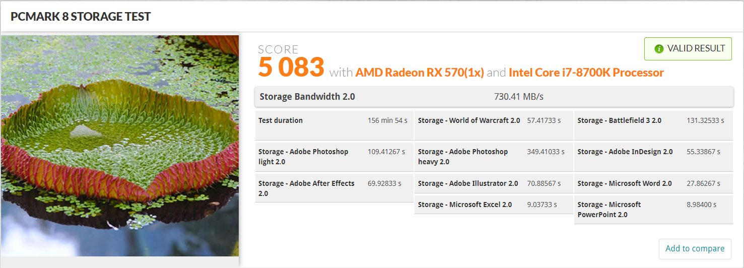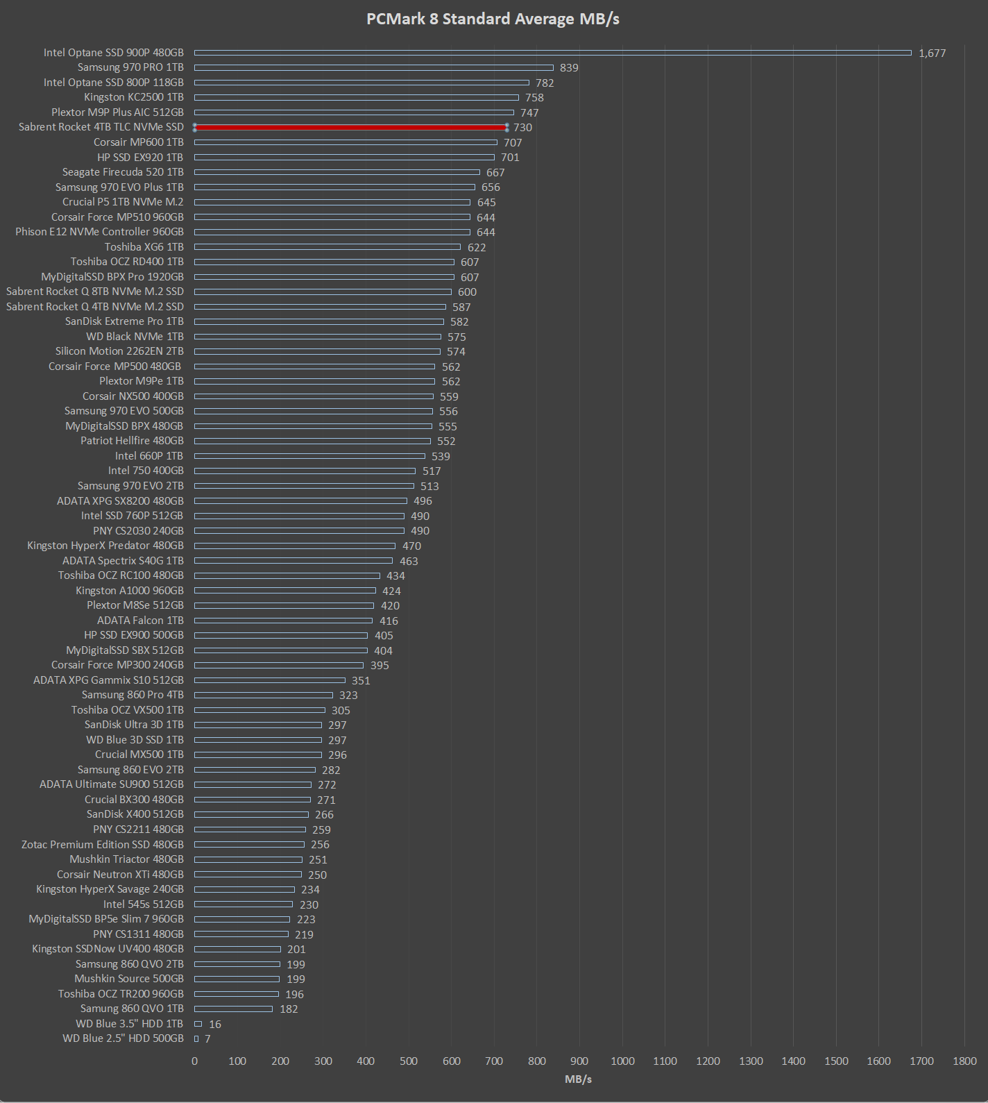 The Sabrent Rocket provides excellent PCMark 8 Test Results, right up there with the best. Top 5!