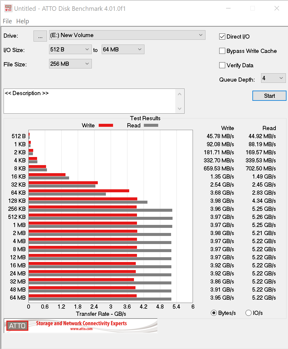 Listed specs are 5GB/s read and 4.4GB/s write and our initial results of 5.2GB/s read and 3.98GB/s write are pretty close to the money…one being a bit higher and one a bit lower.