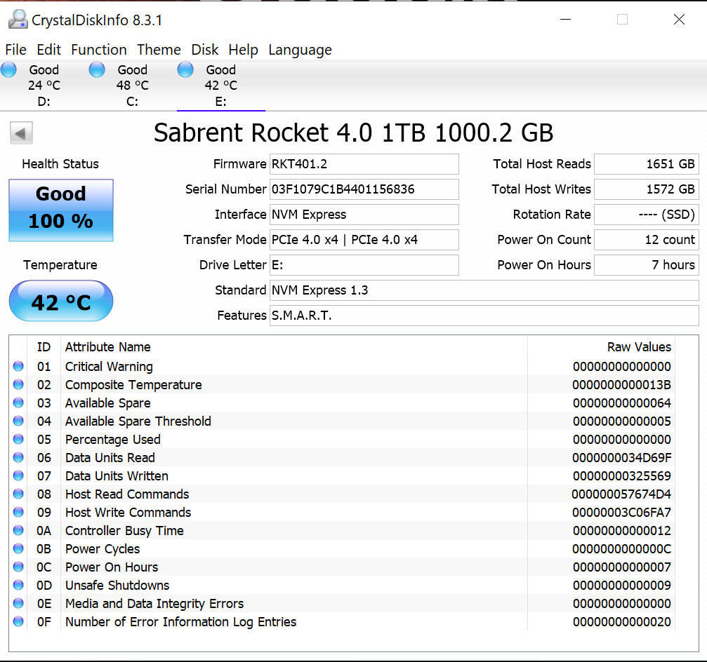Crystal Disk Info validates that our SSD is running in PCIe 4.0 x4 (four lane), and also that NVMe 1.3 protocol is in use.