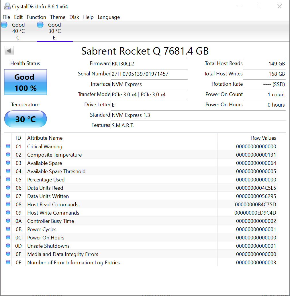 Crystal Disk Info validates that our SSD is running in PCIe 3.0 x4 (four lane), and also that NVMe 1.3 protocol is in use.
