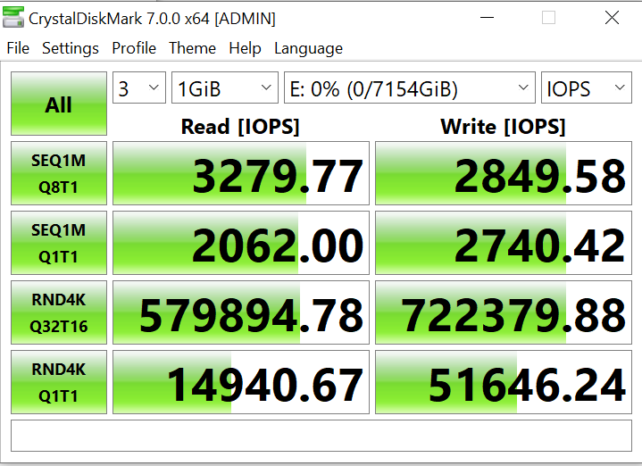 Crystal DiskMark results are fairly consistent with ATTO, at least with respect to the high sequential read and writes. Check out those IOPS!