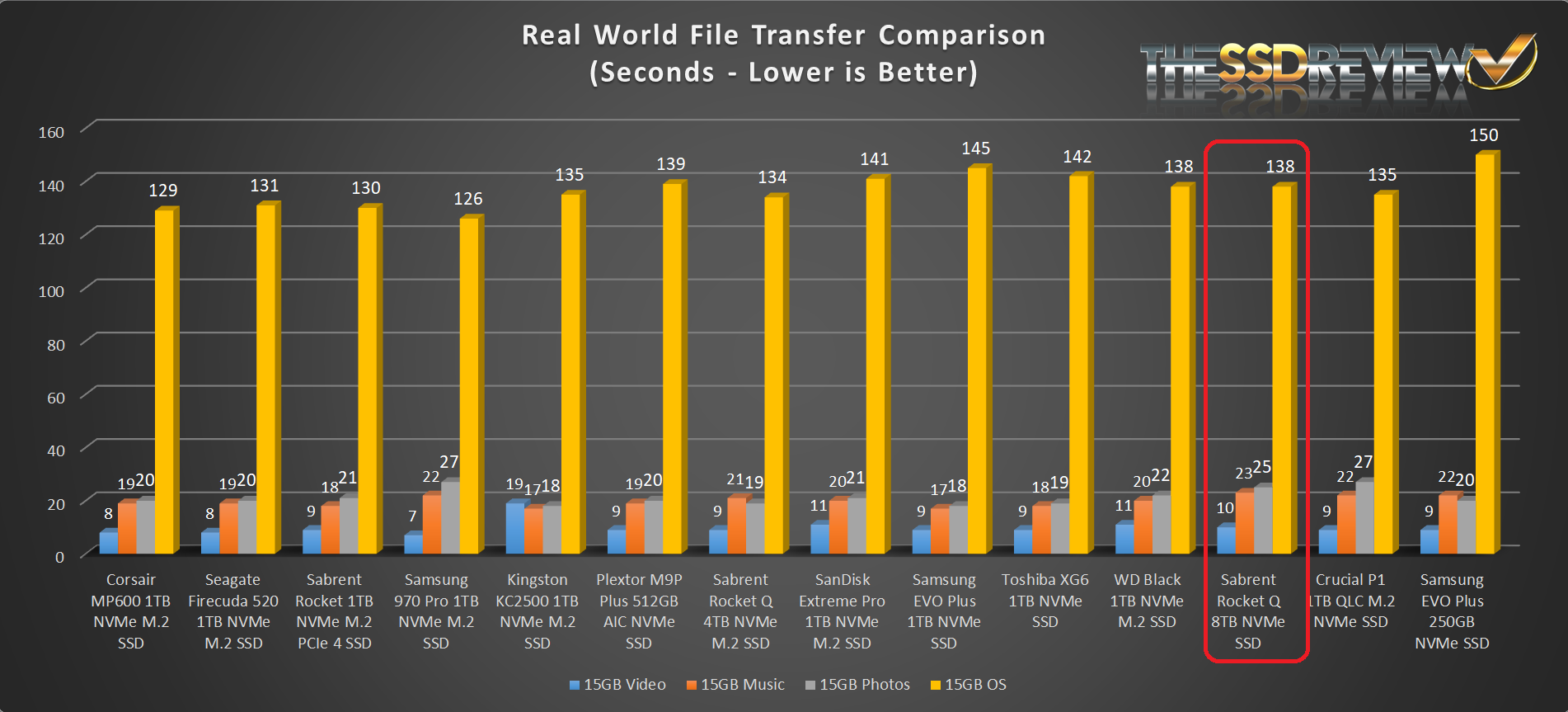 We have put the Sabrent Rocket Q NVMe SSD beside the best in the business for our true to life data testing. In this test, we simply place 15GB files representing music, video, pictures and operating systems onto the target drive. We then copy each file from one place on the target disk to another, recording the time taken for the transfer.