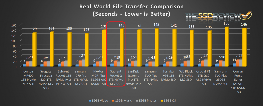 We have put the Sabrent Rocket Q NVMe SSD beside the best in the business for our true to life data testing. In this test, we simply place 15GB files representing music, video, pictures and operating systems onto the target drive. We then copy each file from one place on the target disk to another, recording the time taken for the transfer.