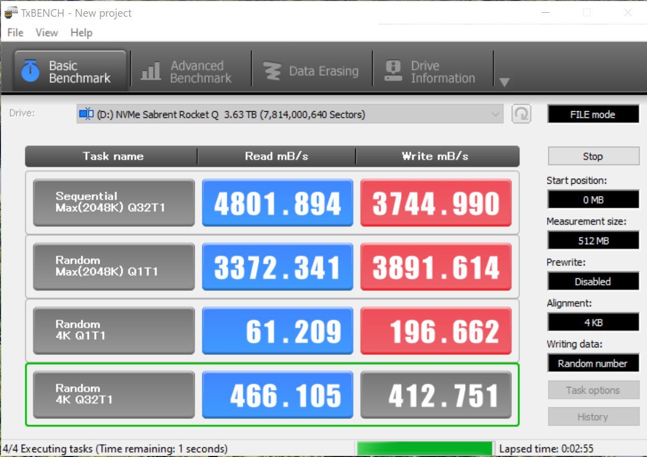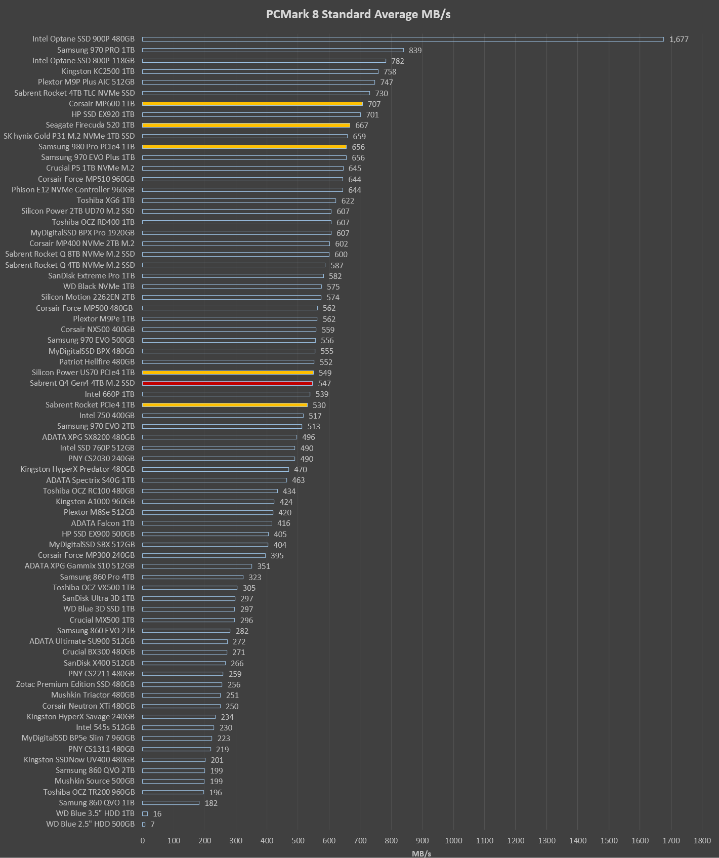 The Sabrent Rocket Q4 returned 547MB/s in its PCMark 8 Storage 2.0 testing which is somewhat low for what we might expect from a Gen 4 SSD. We have highlighted a few others for a basis of comparison.
