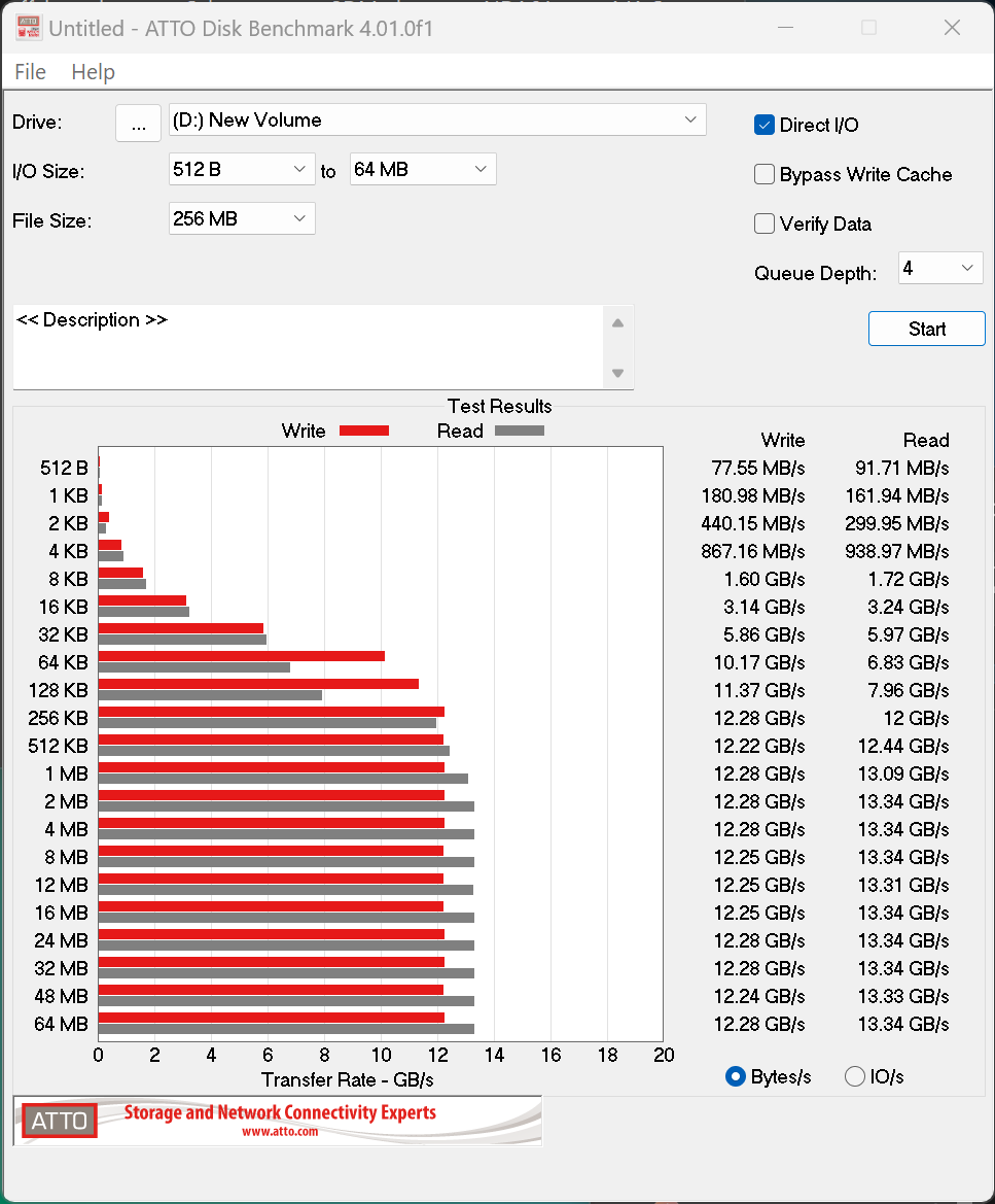 ATTO performance hits highs of 13.34GB/s read and 12.28GB/write which is below listed specs as is the norm for ATTO.