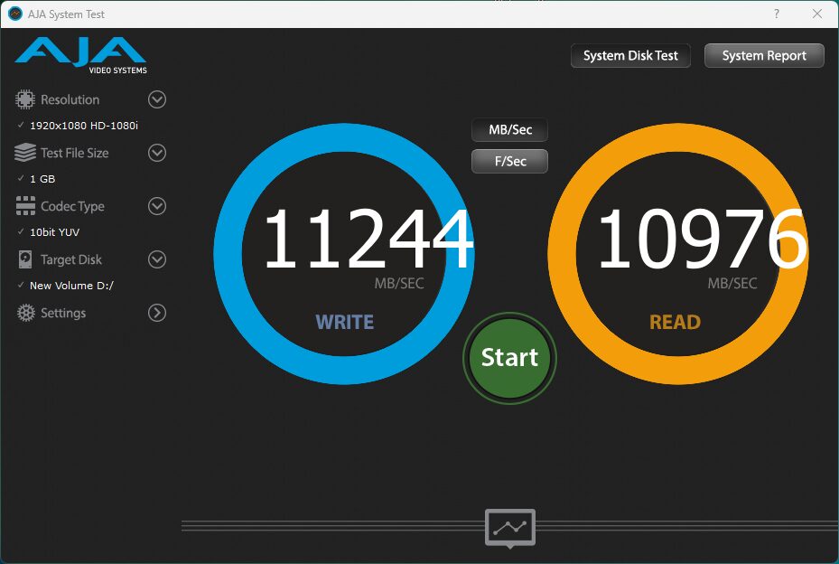 The AJA Video Systems Disk Test is relatively new to our testing and tests the transfer speed of video files with different resolutions and Codec.