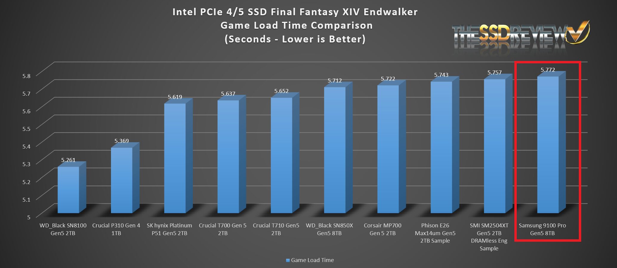 Game load time testing for the Samsung 9100 Pro Gen5 SSD came in at 5.772 seconds, once again attaining Top Ten Status at the No. 10 positiion.