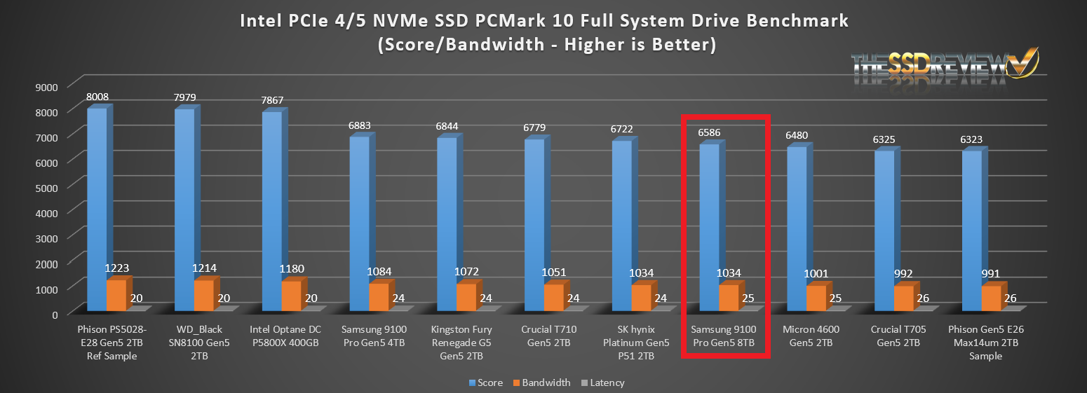 The Samsung P9100 Pro Gen5 SSD placed in the Top 10 at 8th of all SSDs ever tested in PCMark 10 Full System Drive Benchmark.