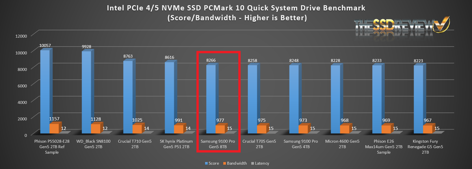 The Samsung 9100 Pro Gen5 8TB SSD placed in the Top 10 of all SSDs tested to date in the No. 5 position on PCMark 10 Quick System Drive Benchmark.