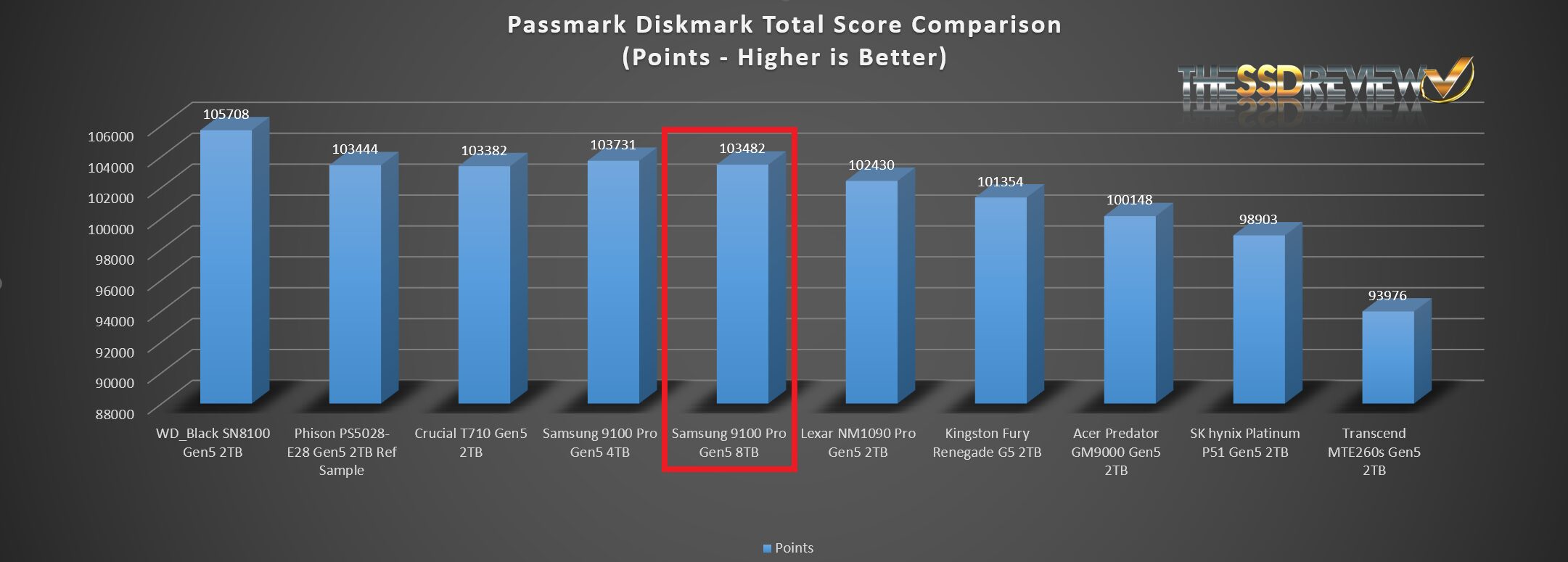 The Samsung 9100 Pro Gen5 SSD placed respectably in the Top 10 results of the PassMark DiskMark Performance benchmark.