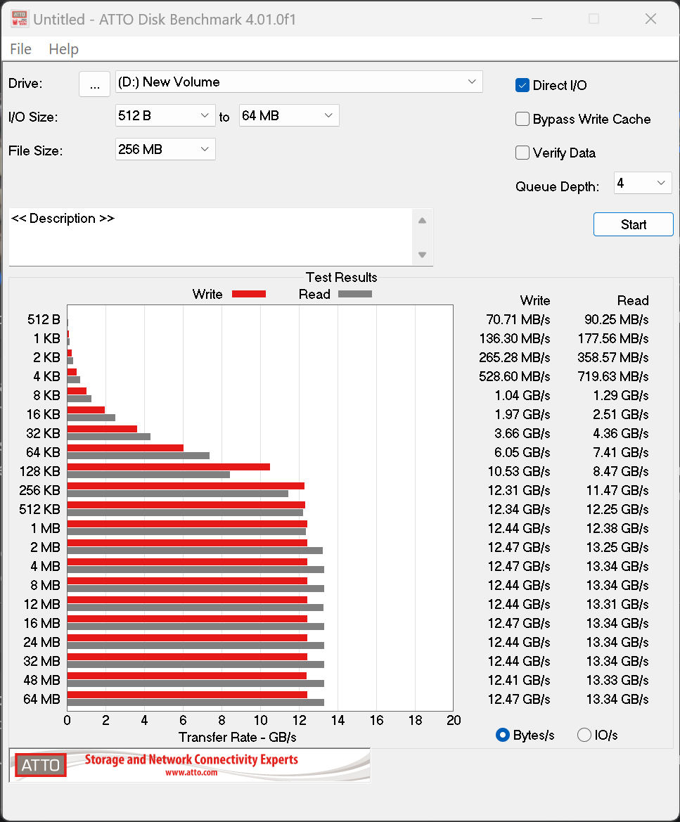 The Samsung 9100 Pro Gen5 SSD reaches ATTO speeds of 13.34GB/s read and 12.47GB/s write which is excellent. As well, we have always found the sign of a solid SSD to be gradual and steady performance increase as data sample sizes increase…just as shown above.