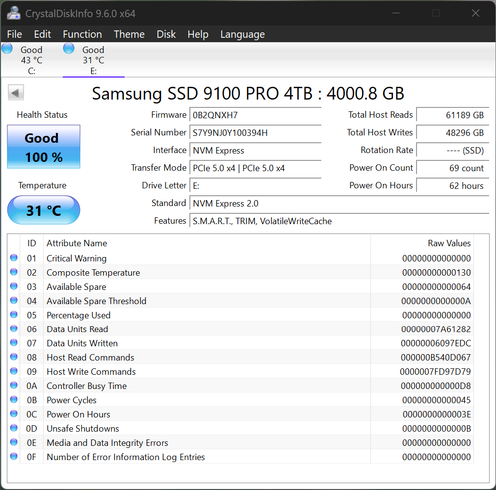 The Samsung 9100 Pro utilizes NVM Express 2.0 and has a feature set of SMART, TRIM and VolatileWriteCache. Of little importance to many but worth mention is that VolatileWriteCache means that a successful write operation has been reported once the data has reached the drives internal cache memory. Take a look at the amount of testing we have put into this Gen 5 SSD – 48TBW!