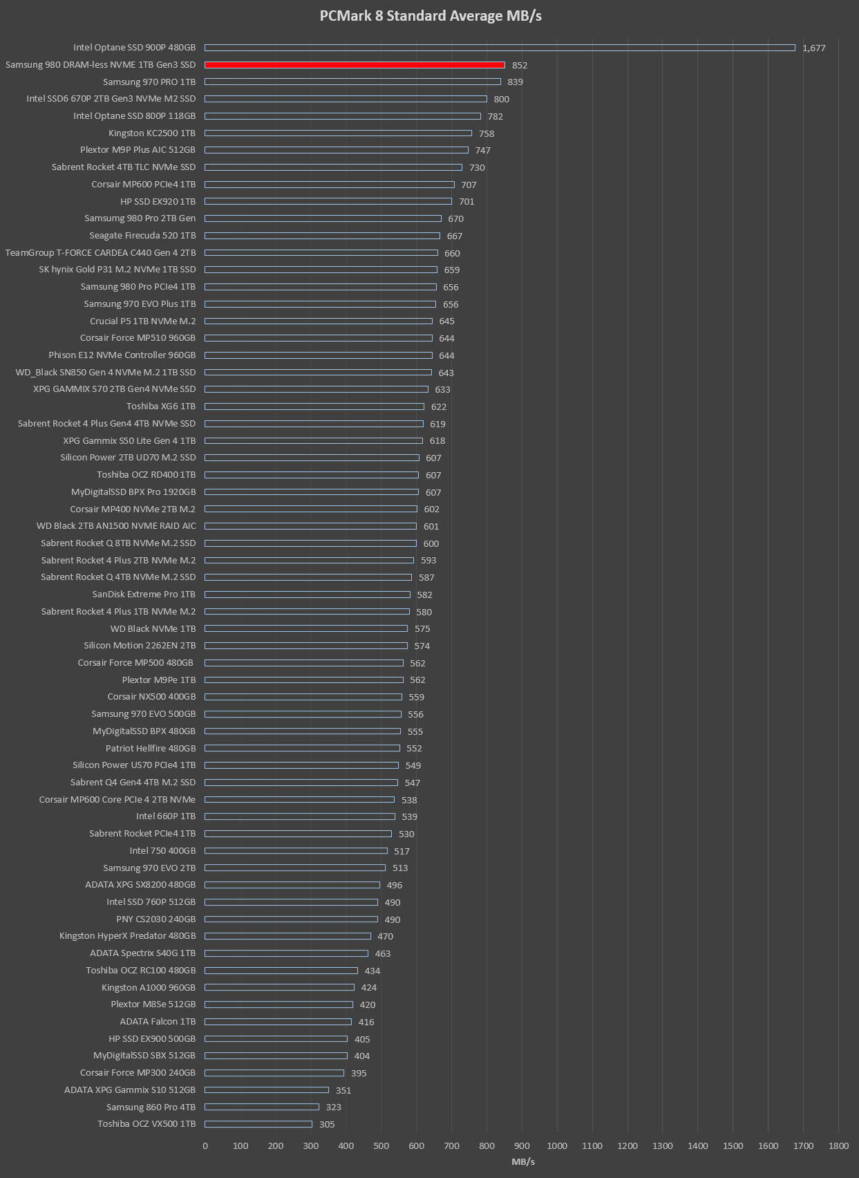 The result from this PCMark 8 Test is that second highest we have ever received…from a DRAM-less SSD. Do we stand by the result? Yup. We ran it a number of times. Is it time to retire PCMark 8? Perhaps but if you look at the PCMark 10 result below, the Samsung 980 came back with great marks there as well. Part of the reason we run so many different tests is because SSDs can be fine tuned to different benchmarks. The 980 seems to be fine tuned for all…as well as our True Data testing which you will see shortly.