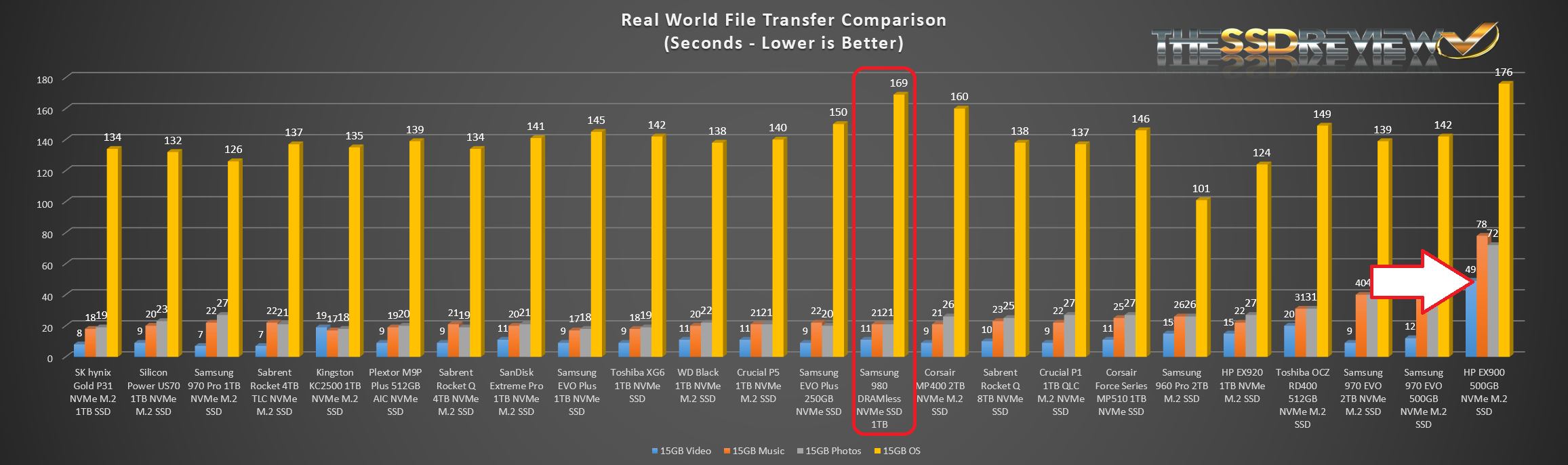Only through this test have we seen the Samsung 980 get pushed back just a bit. It has been rock solid through all other testing, definitely not showing the lineage of a DRAM-less SSD. Even here though, the ONLY other DRAM-less SSD to place on this chart is right there at the end, the HP EX900.