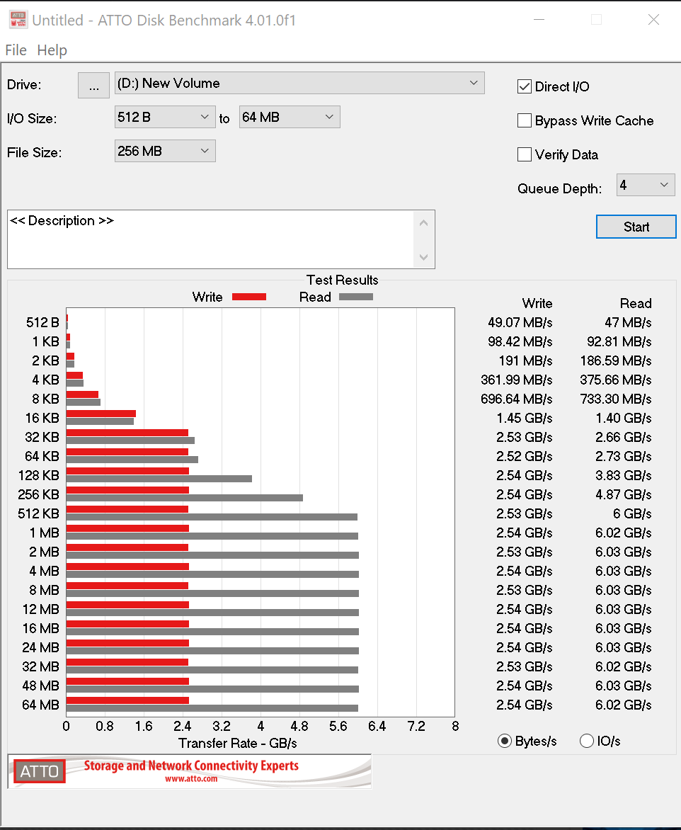 ATTO Disk Benchmark is perhaps one of the oldest benchmarks going and is definitely the main staple for manufacturer performance specifications. ATTO uses RAW or compressible data and, for our benchmarks, we use a set length of 256mb and test both the read and write performance of various transfer sizes ranging from 512b to 65mb. Manufacturers prefer this method of testing as it deals with raw (compressible) data rather than random (includes incompressible data) which, although more realistic, results in lower performance results.